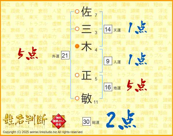 佐(7画)三(3画)木(4画) 正(5画)敏(11画)