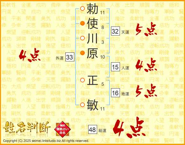 勅(11画)使(8画)川(3画)原(10画) 正(5画)敏(11画)