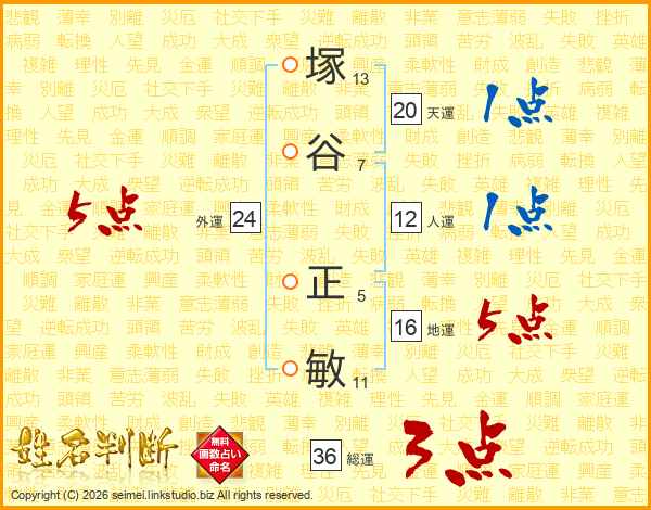 塚(13画)谷(7画) 正(5画)敏(11画)