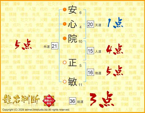 生活面を象徴する運勢です。外部から受ける影響力を表し、結婚運、家庭運や職場、環境への順応性を表します。総運から人運を引いた画数。姓や名が1文字の場合を除く。