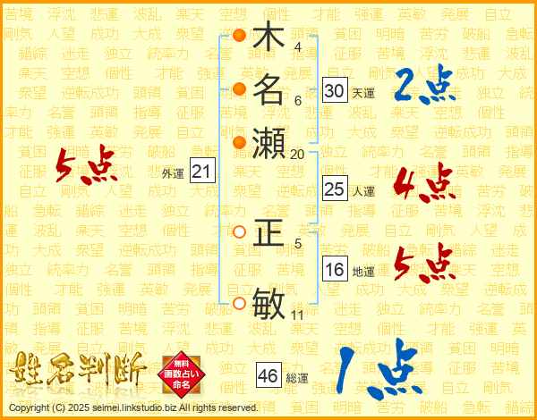 木(4画)名(6画)瀬(20画) 正(5画)敏(11画)