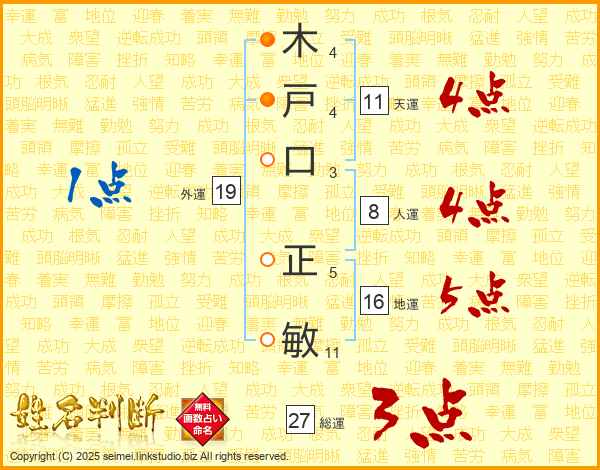 木(4画)戸(4画)口(3画) 正(5画)敏(11画)