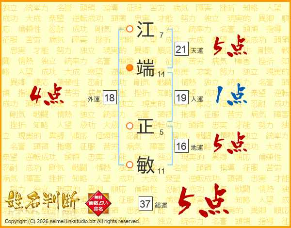 あなたの人生を表す1番重要な運勢です。生涯を通じて影響する総合運となり、主に50歳以降の晩年期に影響を及ぼします。苗字と名前の合計画数。