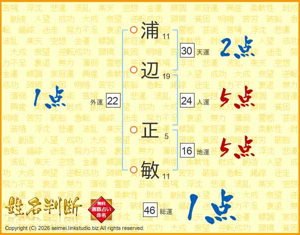 浦(11画)辺(19画) 正(5画)敏(11画)