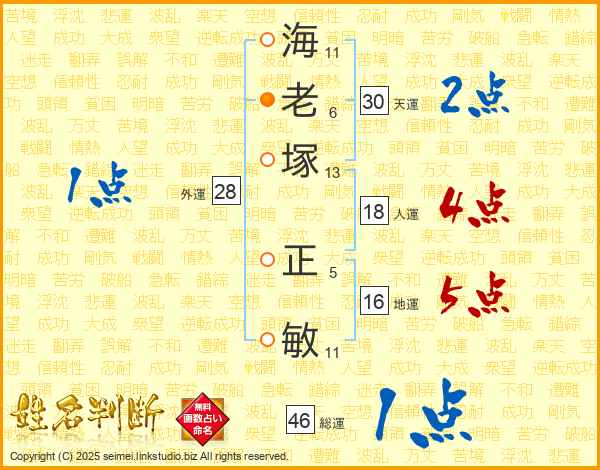 海(11画)老(6画)塚(13画) 正(5画)敏(11画)