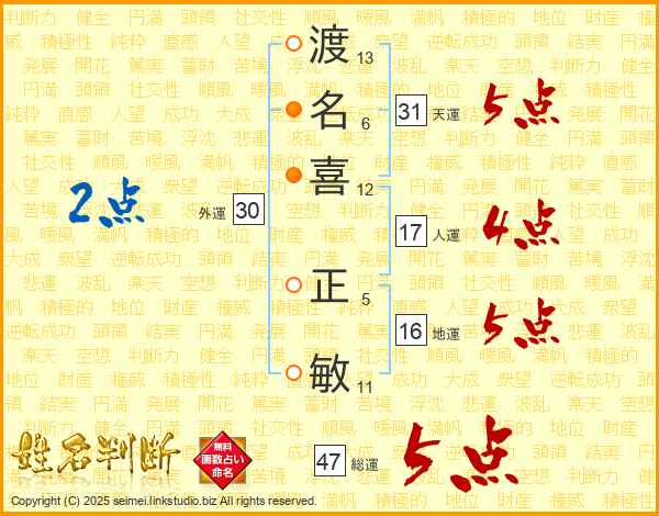 渡(13画)名(6画)喜(12画) 正(5画)敏(11画)