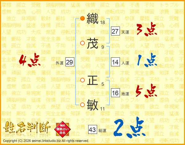 織(18画)茂(9画) 正(5画)敏(11画)