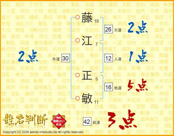 藤江正敏さんの天運は26画の2点!