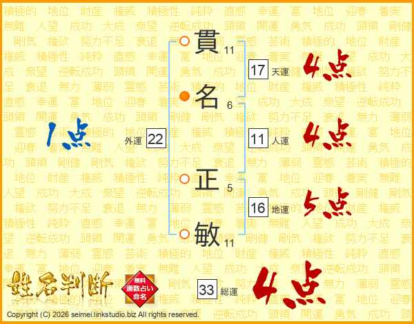 貫(11画)名(6画) 正(5画)敏(11画)