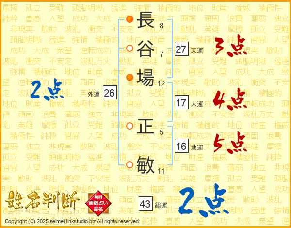 長(8画)谷(7画)場(12画) 正(5画)敏(11画)