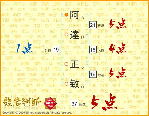 阿(8画)達(13画) 正(5画)敏(11画)