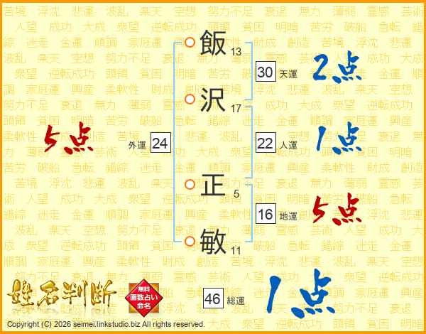 飯沢正敏さんの人運は22画の1点!