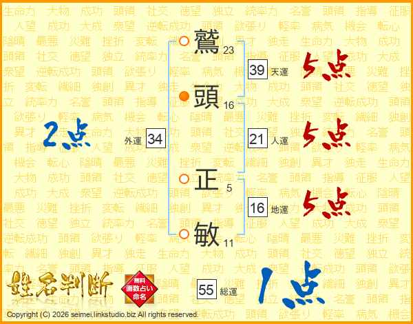 鷲(23画)頭(16画) 正(5画)敏(11画)