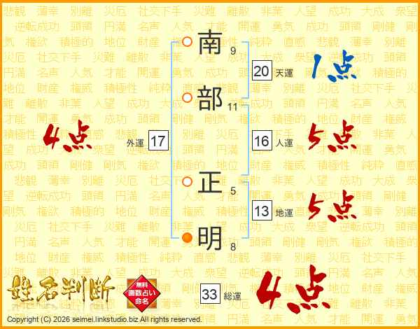 あなたの人生を表す1番重要な運勢です。生涯を通じて影響する総合運となり、主に50歳以降の晩年期に影響を及ぼします。苗字と名前の合計画数。