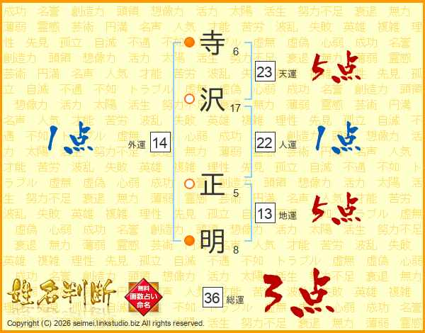 寺(6画)沢(17画) 正(5画)明(8画)