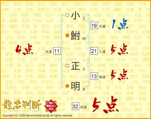 小(3画)鮒(16画) 正(5画)明(8画)