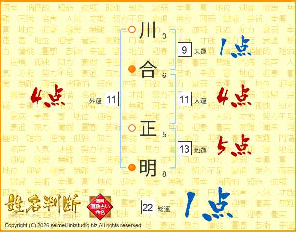 あなたの人生を表す1番重要な運勢です。生涯を通じて影響する総合運となり、主に50歳以降の晩年期に影響を及ぼします。苗字と名前の合計画数。