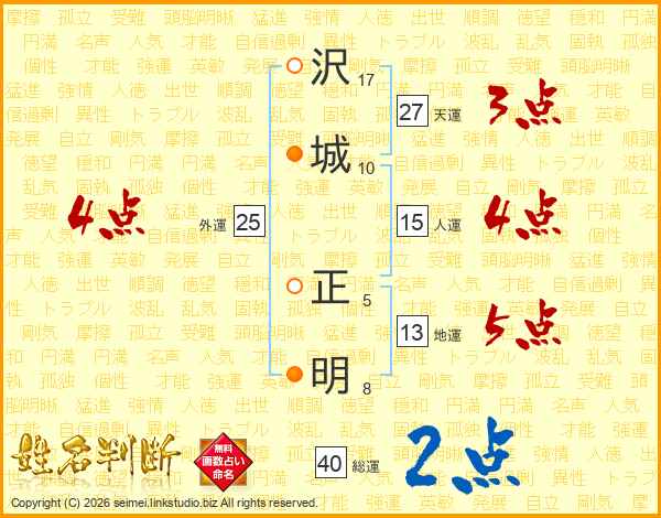 生活面を象徴する運勢です。外部から受ける影響力を表し、結婚運、家庭運や職場、環境への順応性を表します。総運から人運を引いた画数。姓や名が1文字の場合を除く。