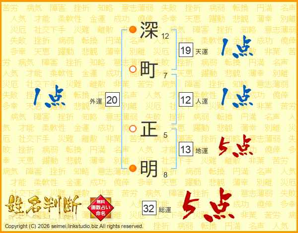 あなたの人生を表す1番重要な運勢です。生涯を通じて影響する総合運となり、主に50歳以降の晩年期に影響を及ぼします。苗字と名前の合計画数。