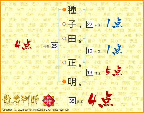 種(14画)子(3画)田(5画) 正(5画)明(8画)
