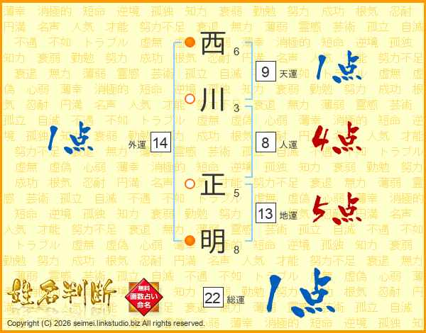 生活面を象徴する運勢です。外部から受ける影響力を表し、結婚運、家庭運や職場、環境への順応性を表します。総運から人運を引いた画数。姓や名が1文字の場合を除く。