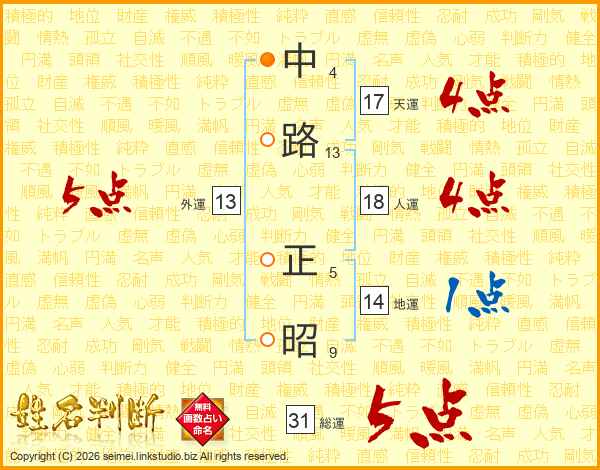 あなたの人生を表す1番重要な運勢です。生涯を通じて影響する総合運となり、主に50歳以降の晩年期に影響を及ぼします。苗字と名前の合計画数。