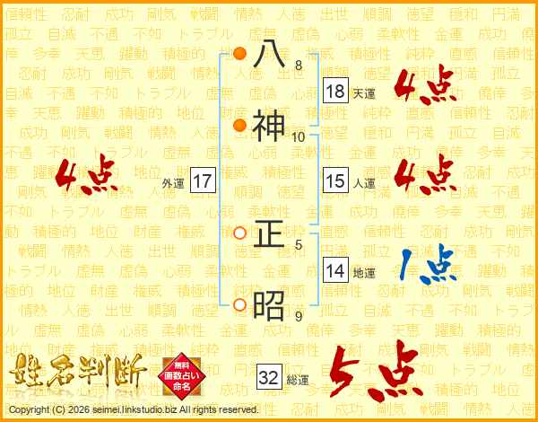 八神正昭さんの総運は32画の5点!