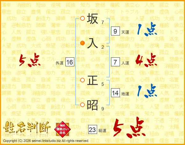 坂入正昭さんの総運は23画の5点!