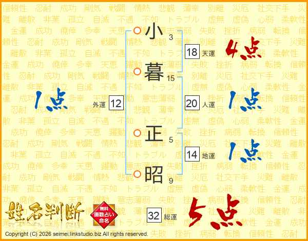 生活面を象徴する運勢です。外部から受ける影響力を表し、結婚運、家庭運や職場、環境への順応性を表します。総運から人運を引いた画数。姓や名が1文字の場合を除く。
