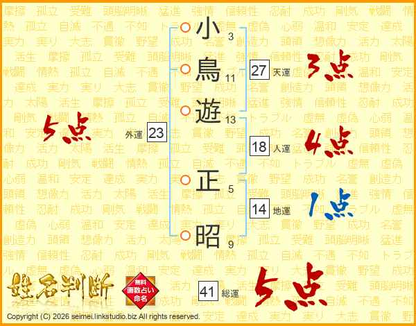 小鳥遊正昭さんの総運は41画の5点!