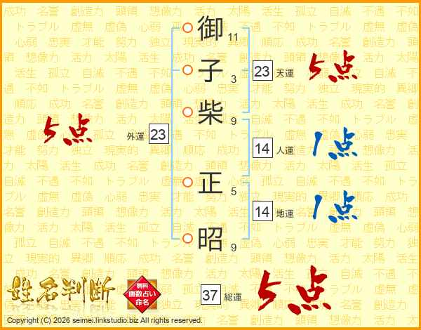 御(11画)子(3画)柴(9画) 正(5画)昭(9画)