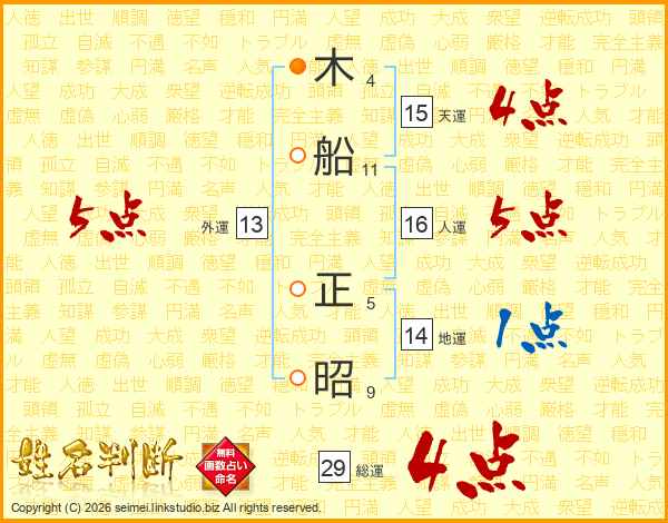 あなたの人生を表す1番重要な運勢です。生涯を通じて影響する総合運となり、主に50歳以降の晩年期に影響を及ぼします。苗字と名前の合計画数。