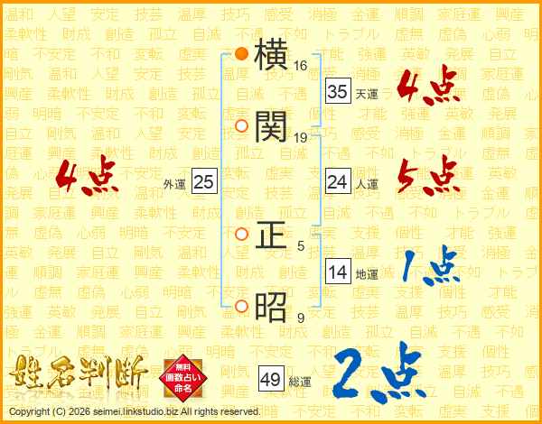 生活面を象徴する運勢です。外部から受ける影響力を表し、結婚運、家庭運や職場、環境への順応性を表します。総運から人運を引いた画数。姓や名が1文字の場合を除く。