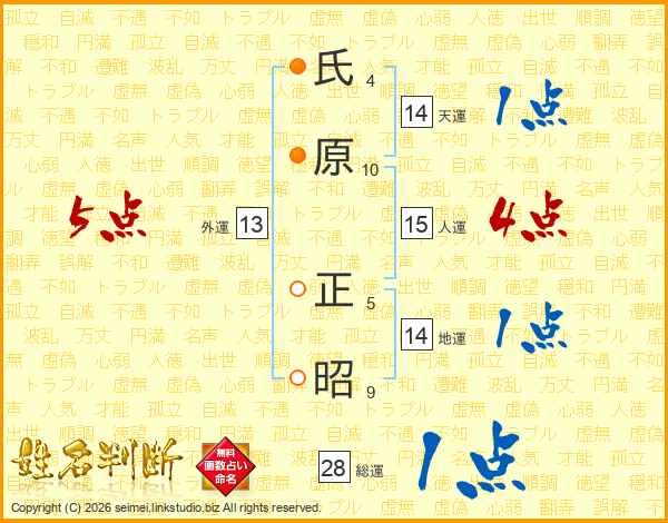 生活面を象徴する運勢です。外部から受ける影響力を表し、結婚運、家庭運や職場、環境への順応性を表します。総運から人運を引いた画数。姓や名が1文字の場合を除く。