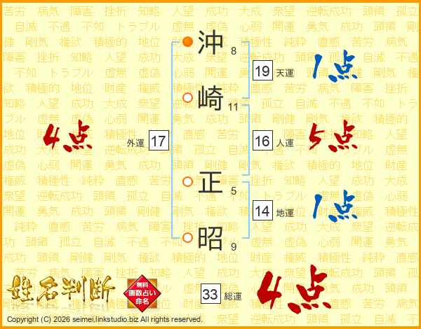 沖(8画)崎(11画) 正(5画)昭(9画)