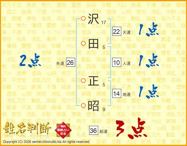 生活面を象徴する運勢です。外部から受ける影響力を表し、結婚運、家庭運や職場、環境への順応性を表します。総運から人運を引いた画数。姓や名が1文字の場合を除く。