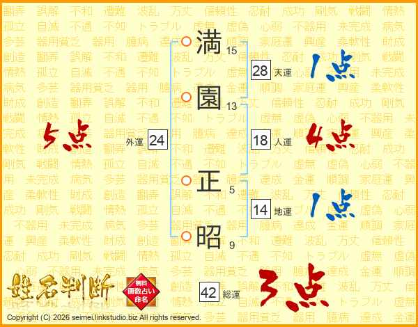 生活面を象徴する運勢です。外部から受ける影響力を表し、結婚運、家庭運や職場、環境への順応性を表します。総運から人運を引いた画数。姓や名が1文字の場合を除く。