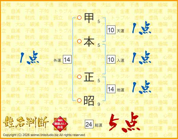 あなたの人生を表す1番重要な運勢です。生涯を通じて影響する総合運となり、主に50歳以降の晩年期に影響を及ぼします。苗字と名前の合計画数。