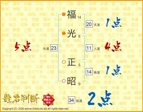 生活面を象徴する運勢です。外部から受ける影響力を表し、結婚運、家庭運や職場、環境への順応性を表します。総運から人運を引いた画数。姓や名が1文字の場合を除く。