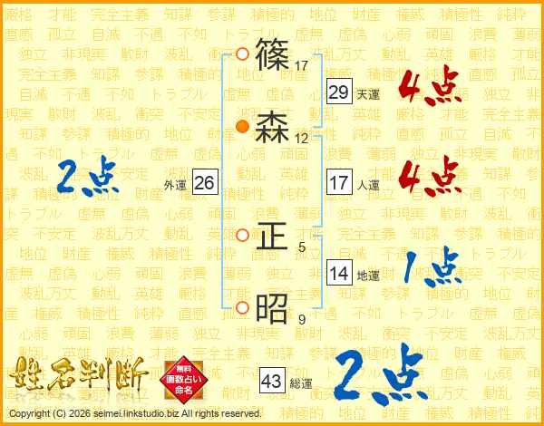 生活面を象徴する運勢です。外部から受ける影響力を表し、結婚運、家庭運や職場、環境への順応性を表します。総運から人運を引いた画数。姓や名が1文字の場合を除く。