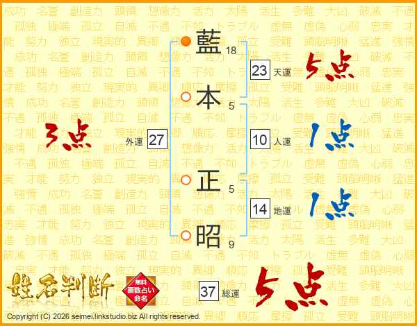 藍(18画)本(5画) 正(5画)昭(9画)