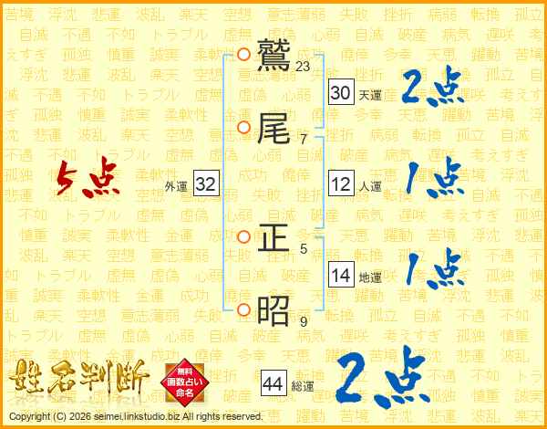 鷲(23画)尾(7画) 正(5画)昭(9画)