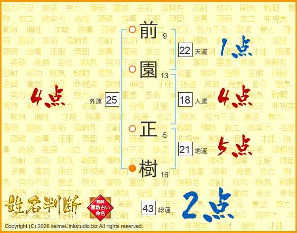 あなたの人生を表す1番重要な運勢です。生涯を通じて影響する総合運となり、主に50歳以降の晩年期に影響を及ぼします。苗字と名前の合計画数。