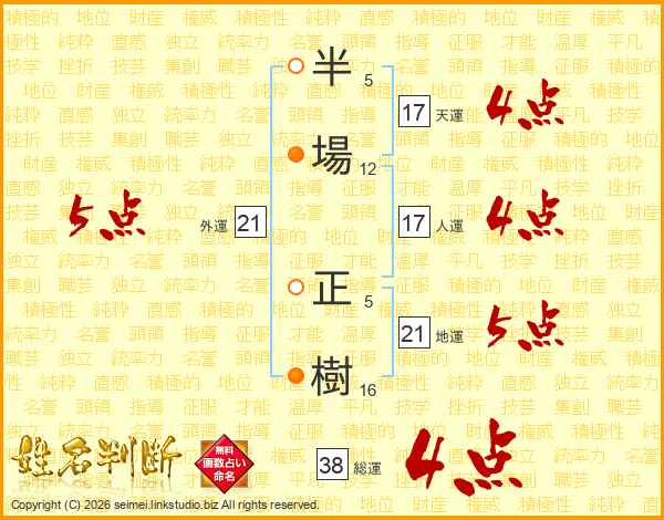 あなたの人生を表す1番重要な運勢です。生涯を通じて影響する総合運となり、主に50歳以降の晩年期に影響を及ぼします。苗字と名前の合計画数。