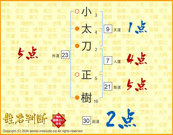 小太刀正樹さんの総運は30画の2点!