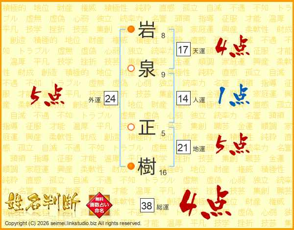 岩(8画)泉(9画) 正(5画)樹(16画)