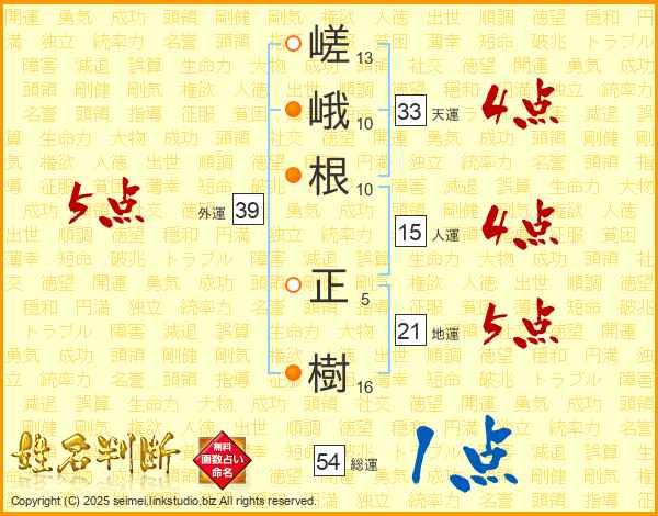 嵯(13画)峨(10画)根(10画) 正(5画)樹(16画)