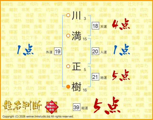 あなたの人生を表す1番重要な運勢です。生涯を通じて影響する総合運となり、主に50歳以降の晩年期に影響を及ぼします。苗字と名前の合計画数。