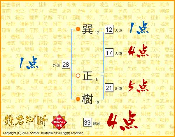 あなたの人生を表す1番重要な運勢です。生涯を通じて影響する総合運となり、主に50歳以降の晩年期に影響を及ぼします。苗字と名前の合計画数。