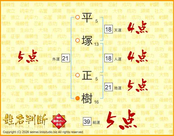 あなたの人生を表す1番重要な運勢です。生涯を通じて影響する総合運となり、主に50歳以降の晩年期に影響を及ぼします。苗字と名前の合計画数。